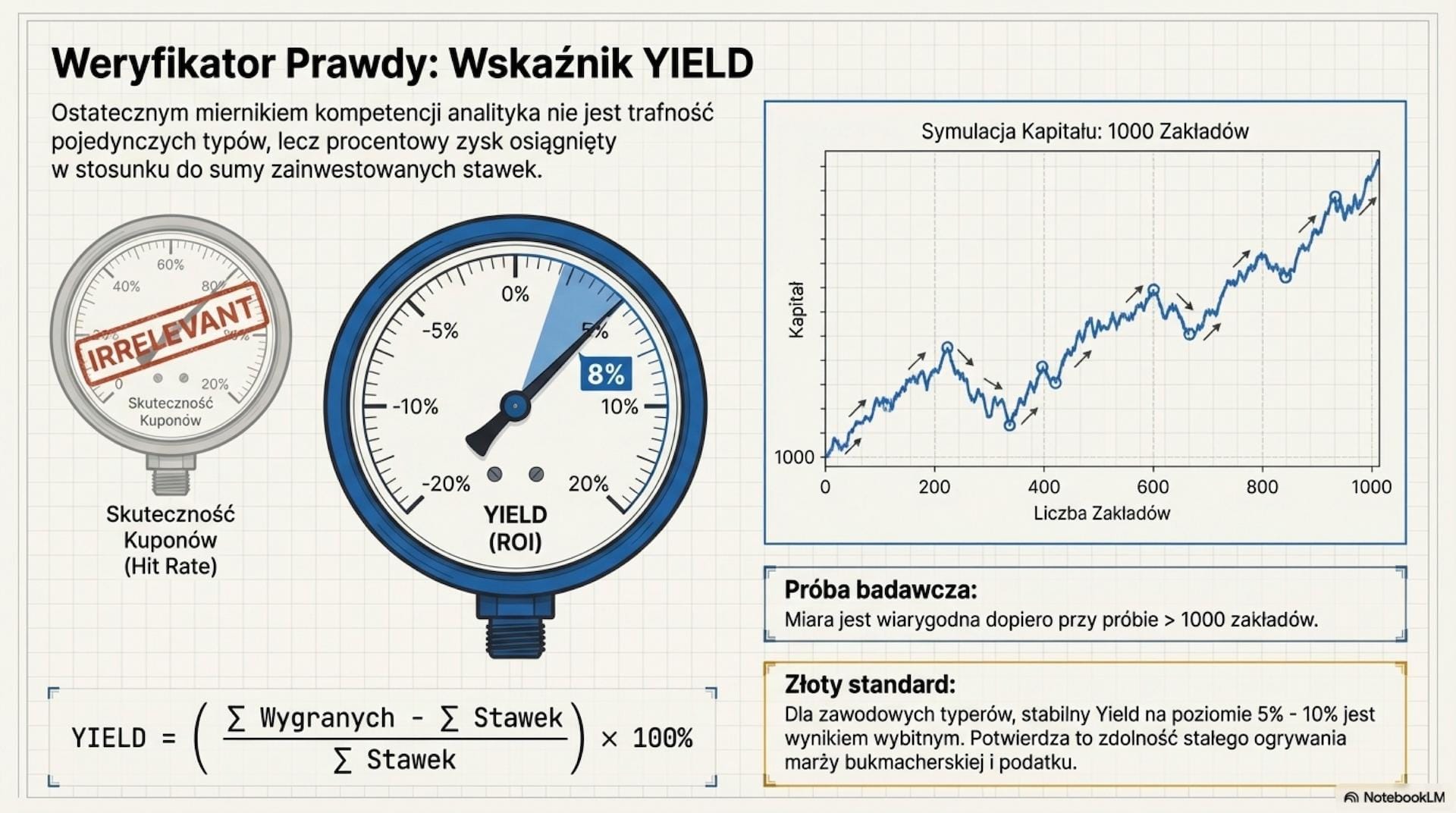 Profesjonalny analityk operuje wskaźnikiem Yield jako miarą efektywności inwestycyjnej. Osiągnięcie Yield na poziomie 5-10% przy próbie statystycznej powyżej 1000 zakładów jest w polskich warunkach fiskalnych wynikiem wybitnym, świadczącym o stałym pokonywaniu marży i podatku. Do ochrony bankrolla stosuje się Kryterium Kelly’ego, optymalizujące stawkę w relacji do przewagi nad rynkiem.